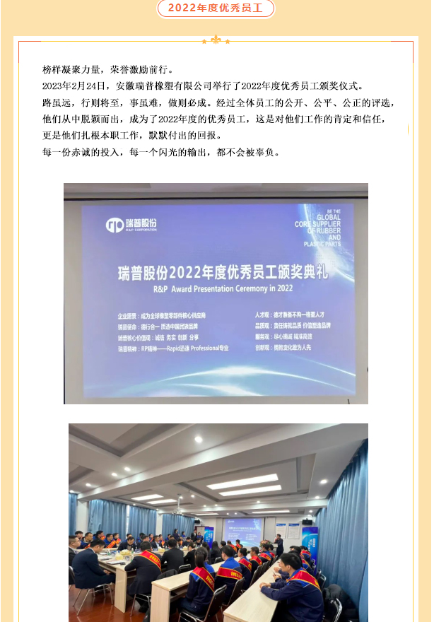 董事長對各部門、子公司負(fù)責(zé)人的2022年度總結(jié)及2023年度工作規(guī)劃進行分析,對大家疫情期間的工作予以肯定,并對其薄弱與不足之處提出改進意見。2023年公司將圍繞開拓新市場、項目管理制度、事業(yè)部智能化制造、員工工作能力、公司管理制度等方面進行提升。努力為員工提供更好的福利待遇,為客戶提供更優(yōu)質(zhì)的服務(wù),為實現(xiàn)瑞普成為全球橡塑零部件核心供應(yīng)商的企業(yè)愿景而不懈努力!
